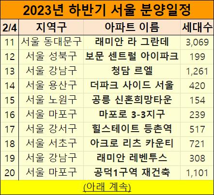 2023년 하반기 서울 아파트 분양 일정표를 만들었습니다.