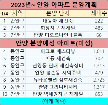 이렇게 2023년에 안양시에서 분양예정인 아파트들을 정리해서 알려드렸는데요.
