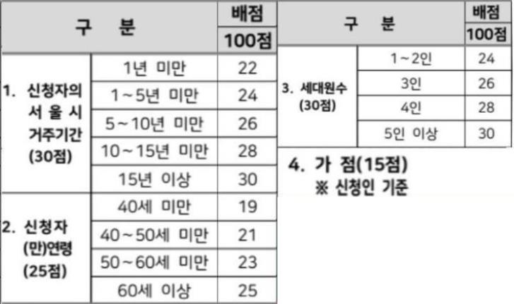가점은 한부모가정 또는 장애여부, 기초수급자와 같은 사회적 약자에 대한 점수가 추가적으로 부여됩니다.