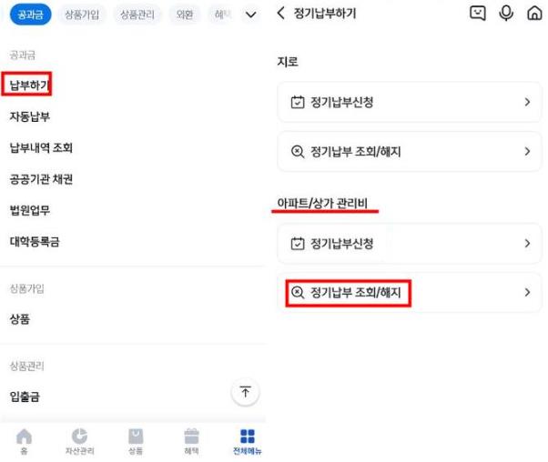 2. 공과금에 보시면 납부하기 탭이 있습니다. 정기납부 조회/해지에 들어가셔서 자동이체를 변경하시면 됩니다.