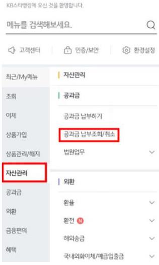 두번째. 자산관리에 보시면 공과금 납부 메뉴가 있습니다. '공과금 납부조회/취소'에서 자동이체 내역을 변경하시면 됩니다.