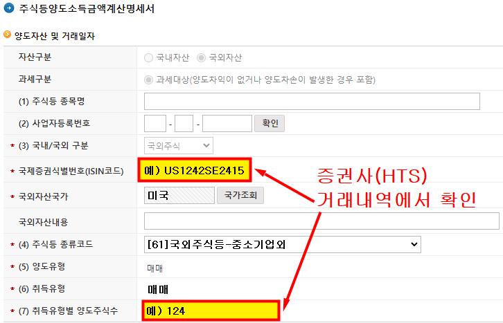 취득가액 및 취득일자 또한 '해외주식 거래내역'에 나와있는대로 입력했습니다.