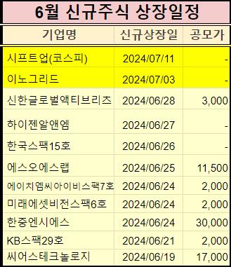 2024년 6월에 신규 상장하는 주식을 표로 정리했습니다.