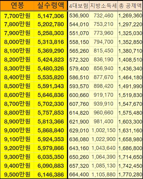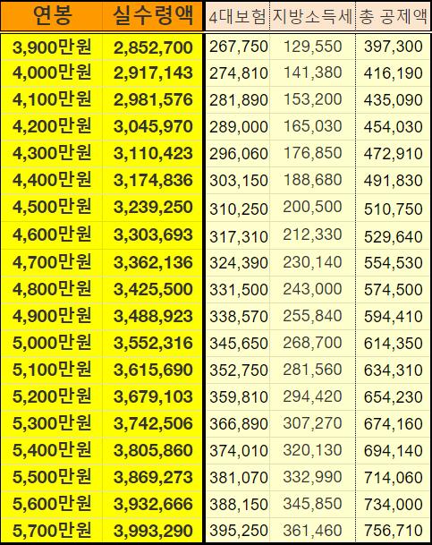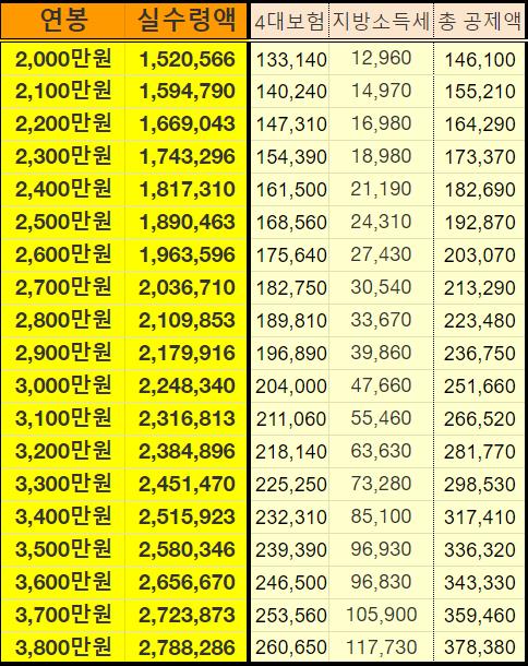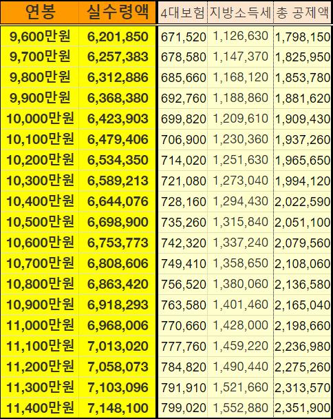 이렇게 연봉 실수령액표를 정리해서 알려드렸습니다.