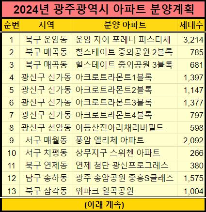 2024년 광주 아파트 분양계획을 표로 만들었습니다.