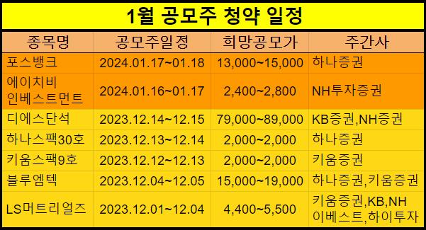 아래 2024년 1월 공모주 청약일정표도 같이 확인하세요.