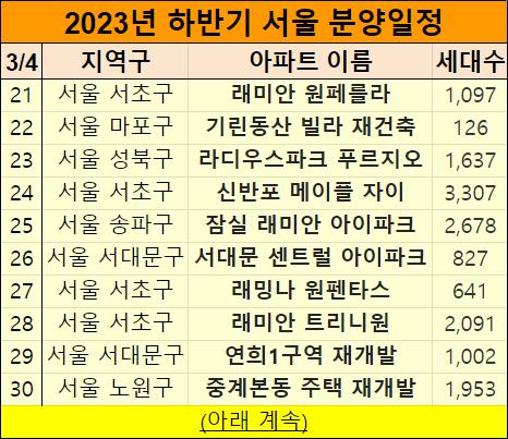 2023년 하반기 서울 아파트 분양 일정표를 만들었습니다.