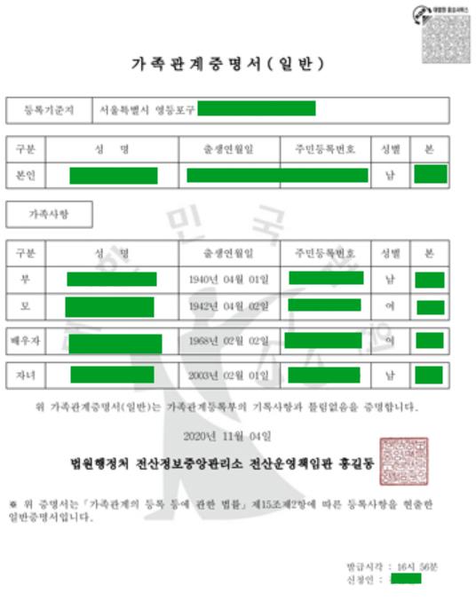 가족관계증명서를 발급할때에는 가급적 주민번호를 비공개하세요.