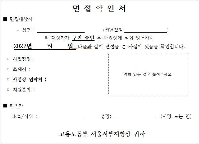 구직활동증빙서류로 면접확인서가 필요하신분들은 사전에 면접보기전에 인사과나 경영지원팀의 사전에 의뢰하시는것이 좋습니다.