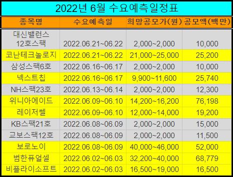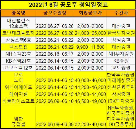 2022년 6월 공모주 청약일정를 표로 정리했습니다.