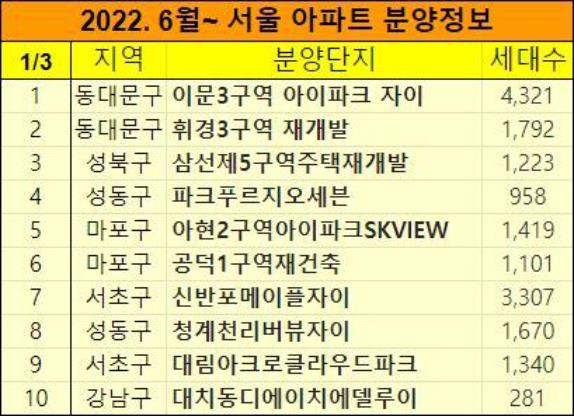 2022년 6월이후 서울 아파트 분양단지들을 표로 정리했습니다. 1,000세대이상의 대단지이면서, 인기 브랜드 아파트 위주로 선정했습니다. 시세차익이 몇억이상 예상되는 서울 분양가상한제 적용