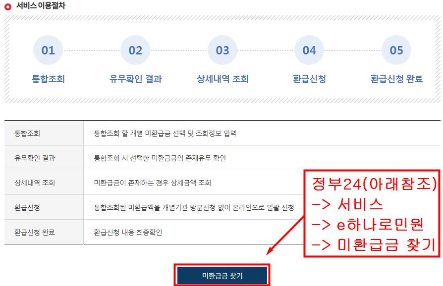 정부24홈페이지→서비스→e하나로민원→민환급금 찾기 신청→통합조회→유뮤확인 결과→상세내역조회→환급신청.