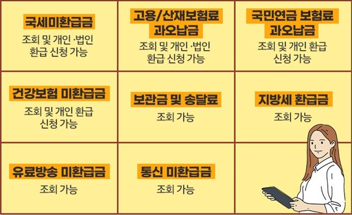 그동안 환급받지못한 세금과 이용료 9개를 한번에 조회할수있습니다.