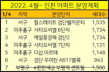 2022년 4월부터 인천에서 분양하는 아파트들을 표로 정리해서 알려드렸습니다.
