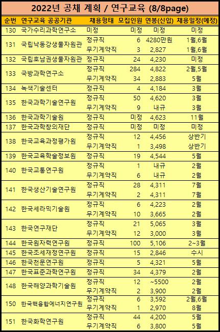 2022년 공기업 채용일정 중 마지막으로 연구직 및 교육시설 분야입니다.