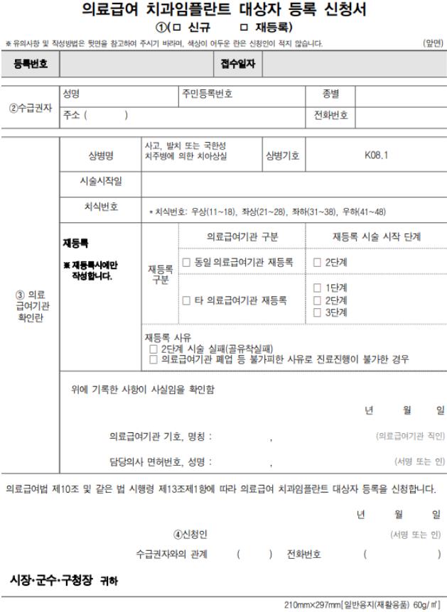 신청방법은 틀니(치과임플란트)등록 신청서를 작성해서 시군군 또는 읍면동에 제출하시면 됩니다.