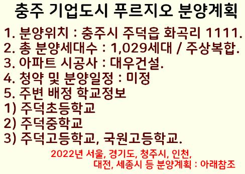 충주 기업도시 주상복합아파트인 푸르지오 분야계획을 정리해서 알려드렸으며 2022년 충주시 근처에 다른지역 아파트 분양계획을 위쪽에 모아놨으니 참조하세요.