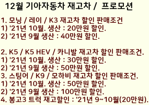 12월에 기아자동차에서 재고차량 할인과 프로모션 및 판매조건을 알려드리겠습니다.