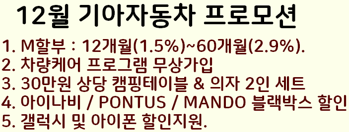 이렇게 기아자동차에서 진행하는 12월 자동차 판매조건별 프로모션을 알아봤습니다.