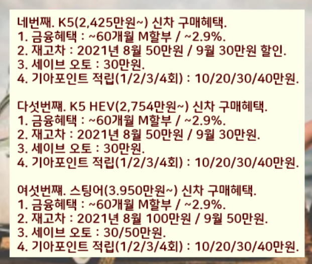 1. 모닝(1,205만원~),레이(1,275만원~),k3(1,770만원~) 2021년 8월 재고차 40만원 / 9월 20만원 할인