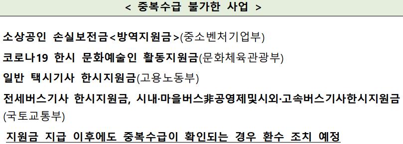 또한 아래 정부에서 지급하는 다른 재난지원금과 중복해서 지원받을수없습니다.