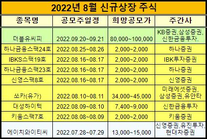 이렇게 2022년 8월에 신규 상장주들을 표로 정리해서 알려드렸습니다.
