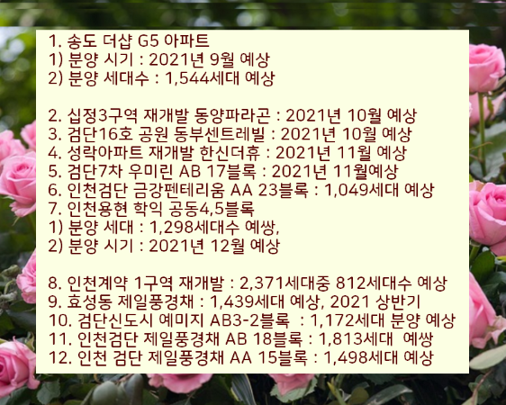 2021년에 인천에서 분양 예정중인 아파트 일정을 힘들게 모아서 총정리하였습니다.