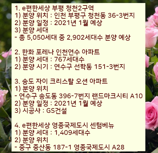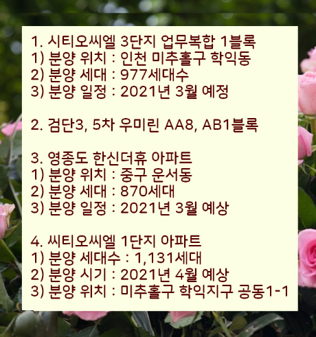 이렇게 2021 인천 아파트 분양일정과 계획을 총저리하였습니다.