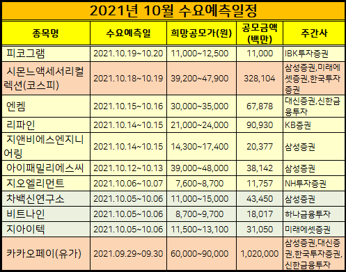 2021년 10월 공모주 청야일정을 정리해서 표로 만들었습니다.