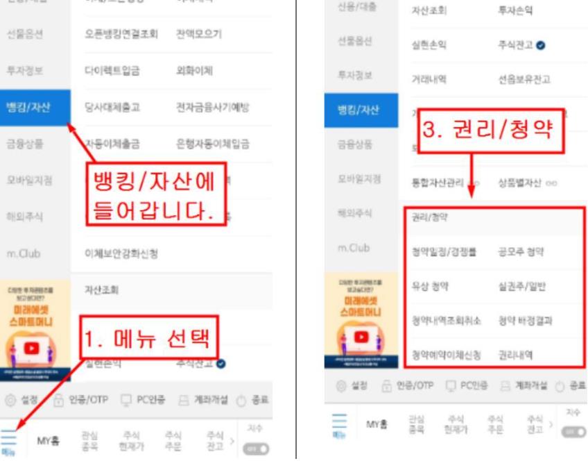 세번째. '뱅킹/자산'에 들어가시면 '권리/청약'이라는 소메뉴에 들어갑니다.