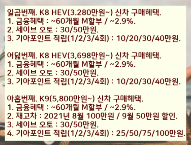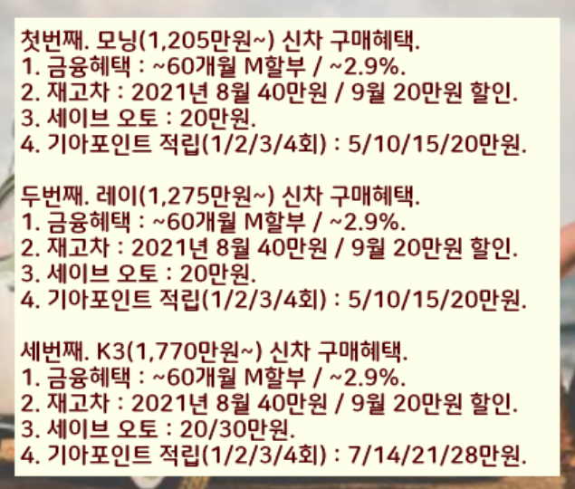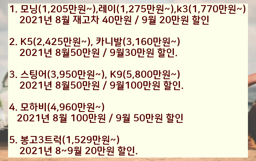 1. 모닝(1,205만원~),레이(1,275만원~),k3(1,770만원~) 2021년 8월 재고차 40만원 / 9월 20만원 할인