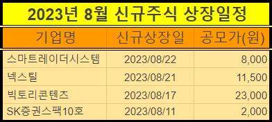2023년 8월에 신규 상장하는 주식들을 표로 정리했습니다.