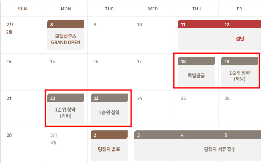 1순위 기타청약은 2월 22일 월요일에 접수받으며, 2순위 청약일은 2월 23일 화요일에 지원하실수있습니다.
