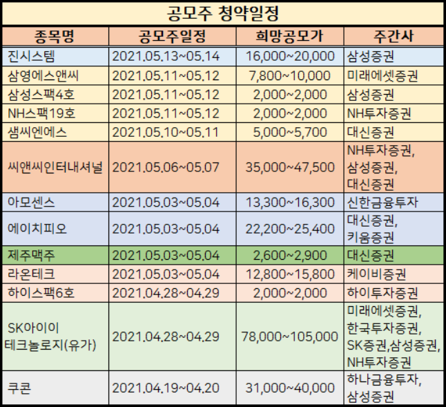 제주맥주, 쿠콘 등 2021년 5월까지 다양한 청약일정을 표로 정리하였습니다.