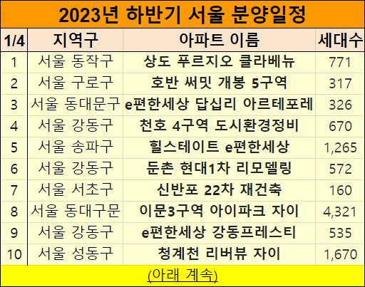 2023년 하반기 서울 아파트 분양 일정표를 만들었습니다.