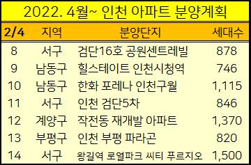 2022년 4월부터 인천에서 분양하는 아파트들을 표로 정리해서 알려드렸습니다.