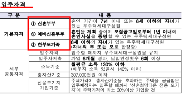 1. 우선 신혼부부는 7년 이내 혹은 6세 이하 자녀가 있는 무주택 세대구성원이어야합니다.