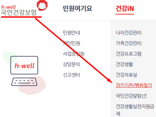 국민건강검진공단 홈페이지에 들어가시면 초기화면에 '검진기관 찾기'를 선택하세요.
