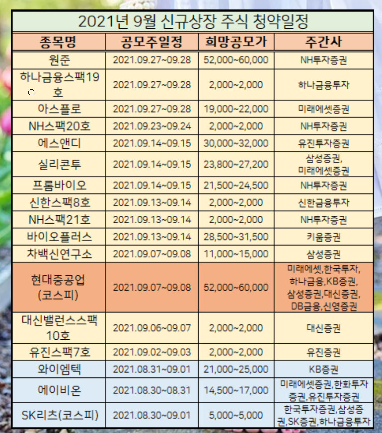 아래에 2021년 9월 공모주 청약일정을 표로 만들어놨으니 참고하시기 바랍니다.